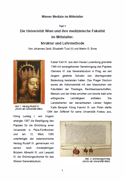Johannes Seidl, Elisabeth Tuisl und Martin Enne, die alle mit dem Archiv der Universität Wien bestens vertraut sind, werden uns zunächst mit kurzen, einführenden Texten den Beginn und den Kontext (Aufbau der Universität, der Fakultät für Medizin und der Lehre der mittelalterlichen Wiener Medizin) näher bringen und danach auf Basis ausgewählter Biographien einige der im 15. Jahrhundert lehrenden Mediziner vorstellen.